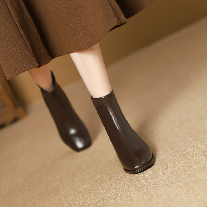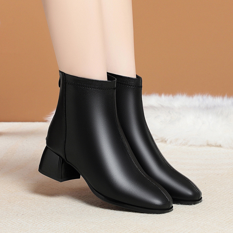 女士软皮短靴女秋冬季新款加绒中粗跟高跟鞋皮鞋春秋单靴一件代发