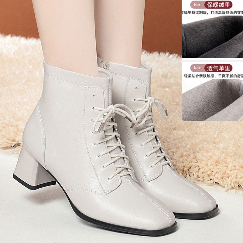 白色短靴女春秋单靴软皮粗跟马丁靴软皮软底中年女士方头粗跟靴子