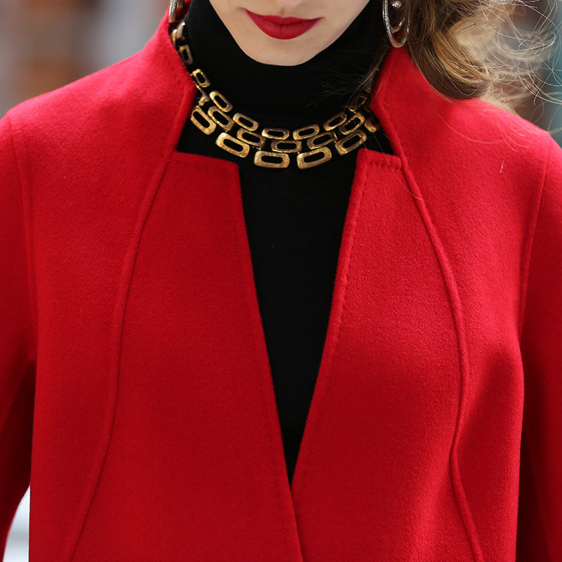 毛呢外套女中长系带收腰高端气质大红色无羊绒春秋新款双面呢大衣