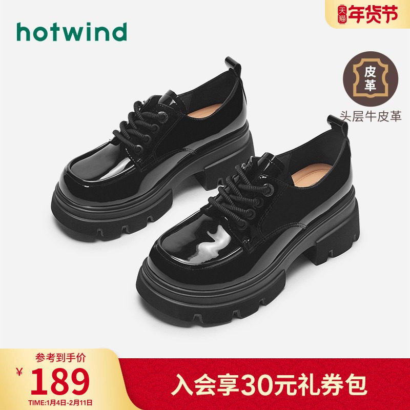 热风黑色小皮鞋2024年秋季新款女士亮面厚底通勤休闲系带圆头单鞋