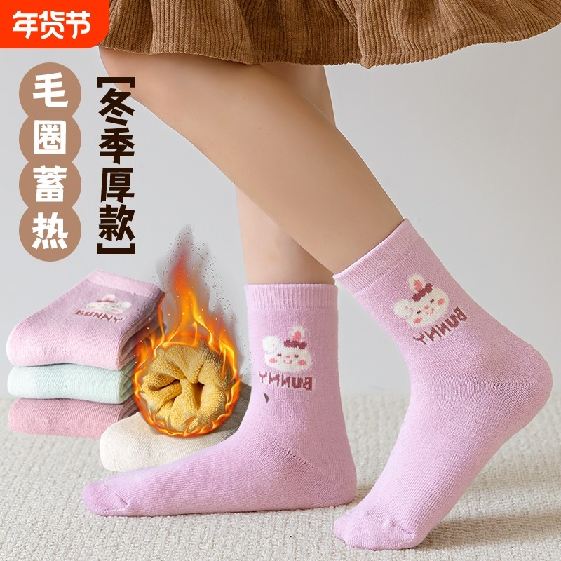 女童袜子冬款毛圈袜儿童秋冬季加绒学生中筒袜女孩宝宝可爱毛巾袜