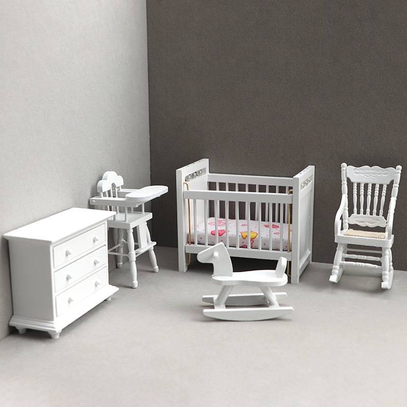 1:12娃娃屋dollhouse迷你家具白色儿童房套装儿童床摇摇马摇椅柜