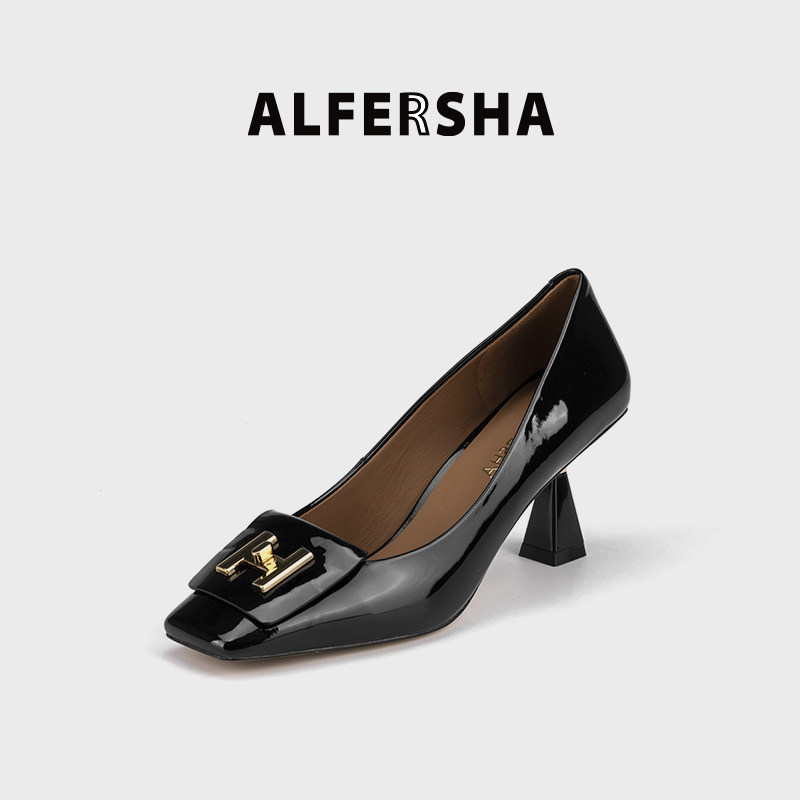 阿芙莎四季法式气质H标简约高跟单鞋漆皮方头浅口细跟高跟鞋套脚