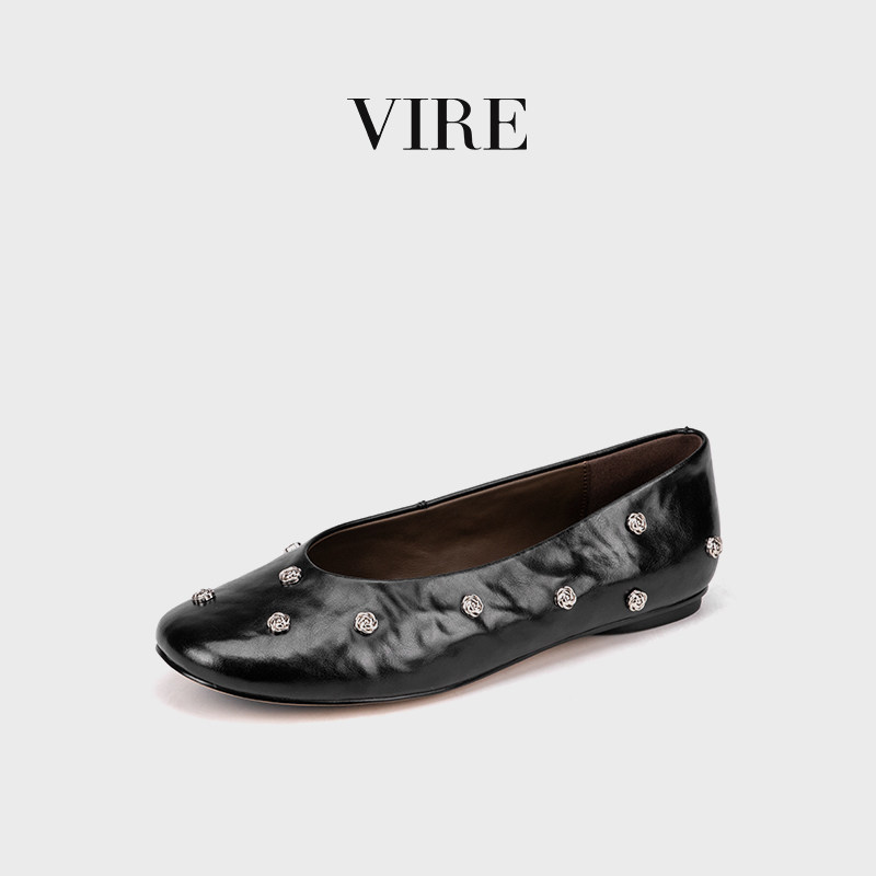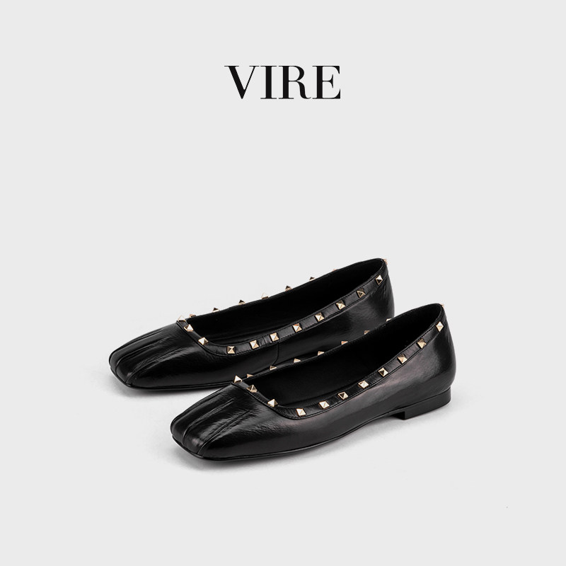 VIRE/953326新款女士气质舒适百搭牛皮真皮方头平跟铆钉镶圈单鞋B