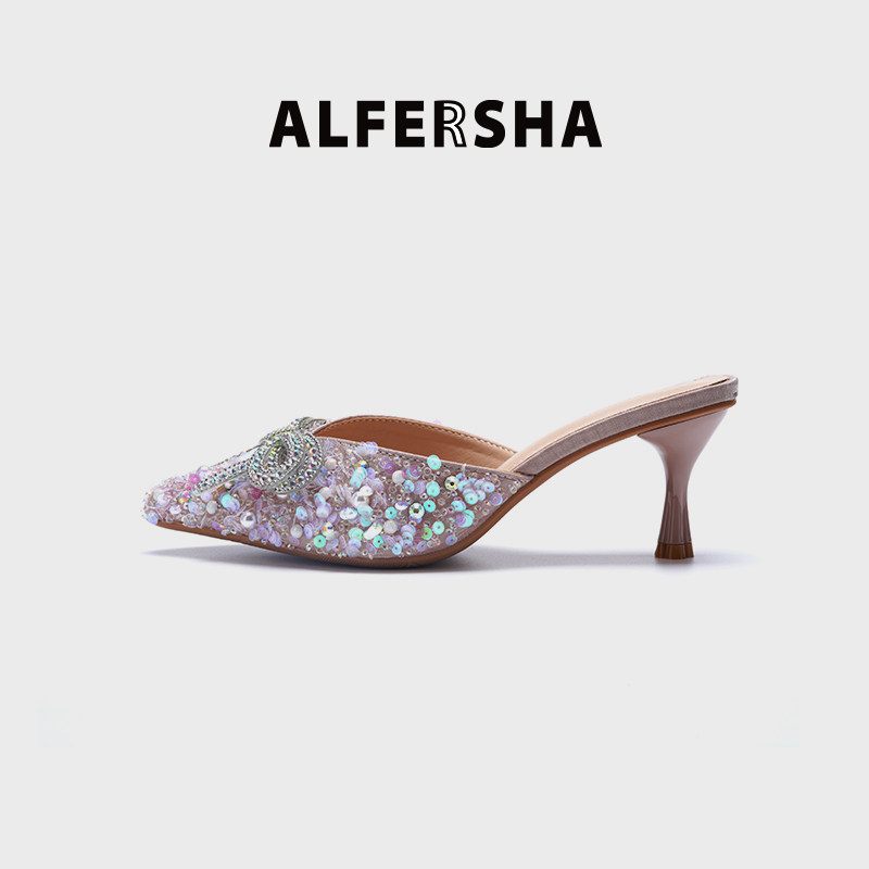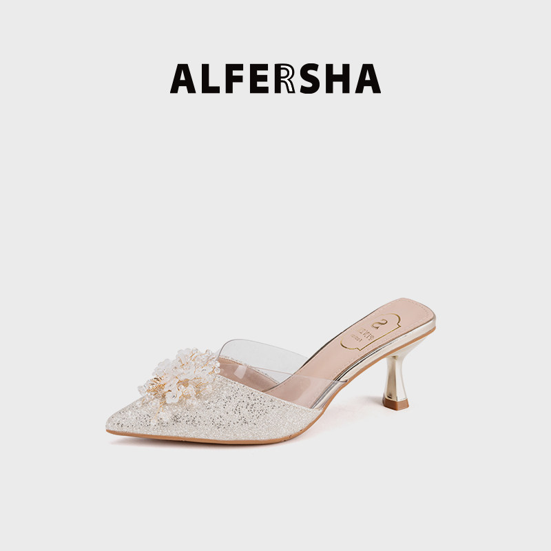 ALFERSHA/阿芙莎手工鞋6658211夏季新款水晶花细跟包头拖女鞋B