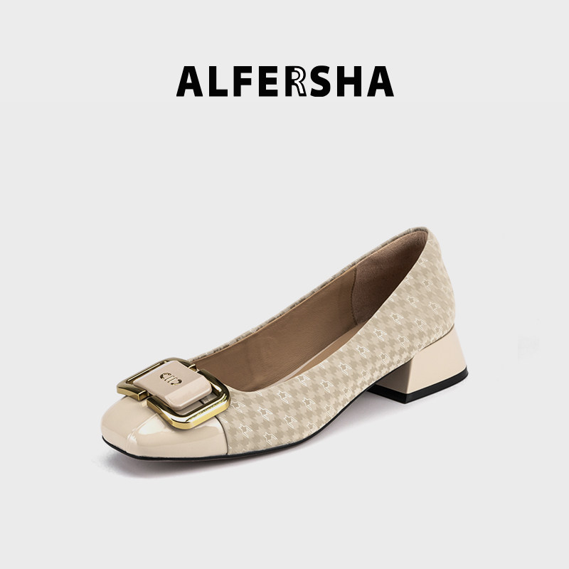 阿芙莎通勤四季粗跟圆扣气质百搭千鸟格金属扣方头浅口单鞋3cm跟