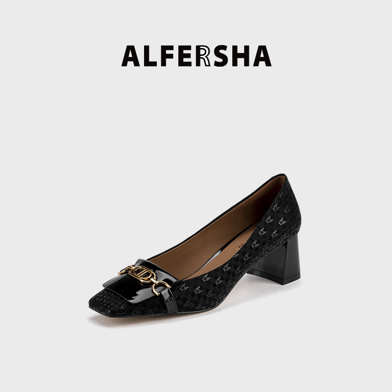 阿芙莎四季百搭通勤千鸟格方头粗跟单鞋时尚通勤漆皮套脚浅口单鞋