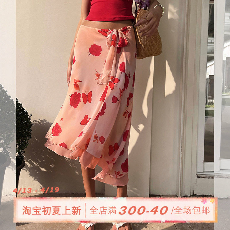 ITSNIKAR复古雪纺印花半身裙女春性感开衩包臀裙荷叶边垂感长裙子