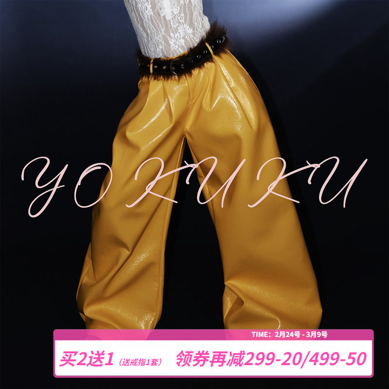 aaaaaxbbb俄勒冈瀑布 黄色黑色拖地皮裤女宽松加长显瘦休闲裤