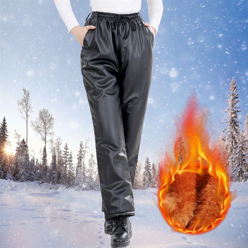 加绒加厚皮裤女宽松中老年高腰骑行防风护腰护膝皮棉裤工作裤艾贝