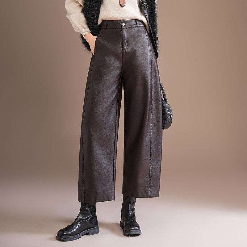 秋冬棕色PU皮裤女新款高腰宽松阔腿休闲直筒裤小个子哈伦九分裤子