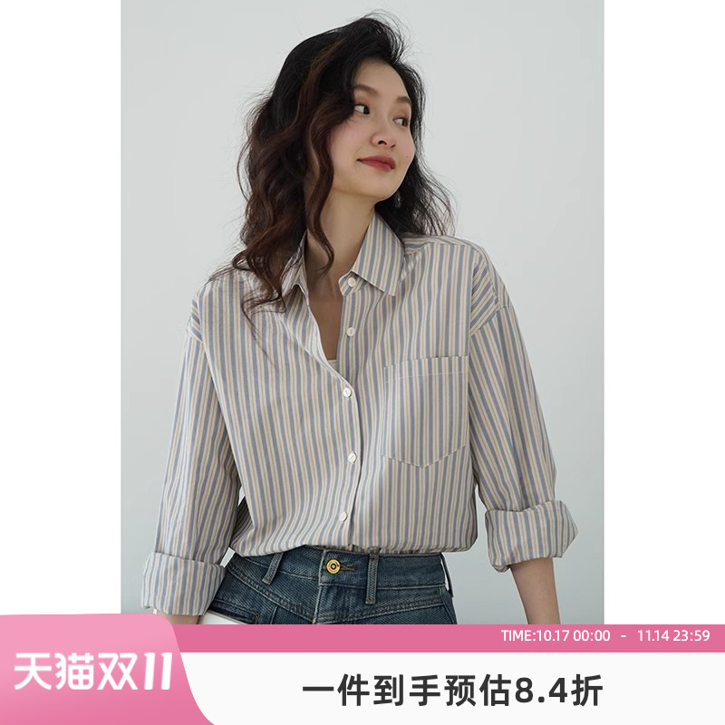 OCHIRLY欧时力 竖条纹中长款衬衫女上衣宽松气质时尚秋冬尖货