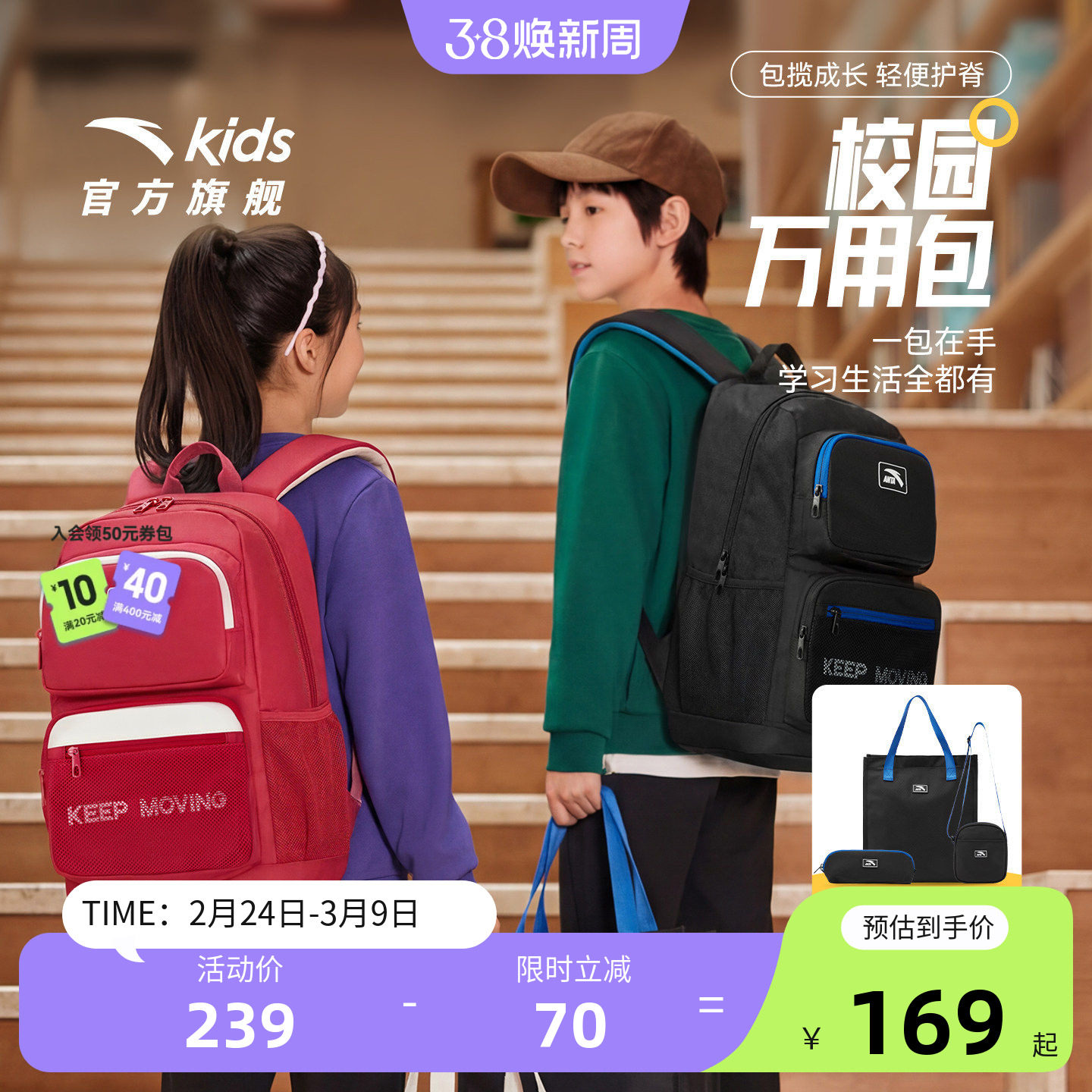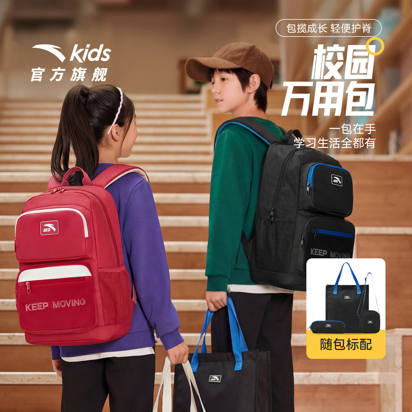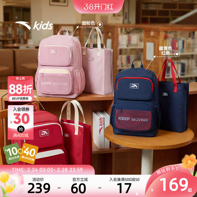 安踏儿童男女童双肩背包+附袋2026年新款大容量小学生3-6年级书包