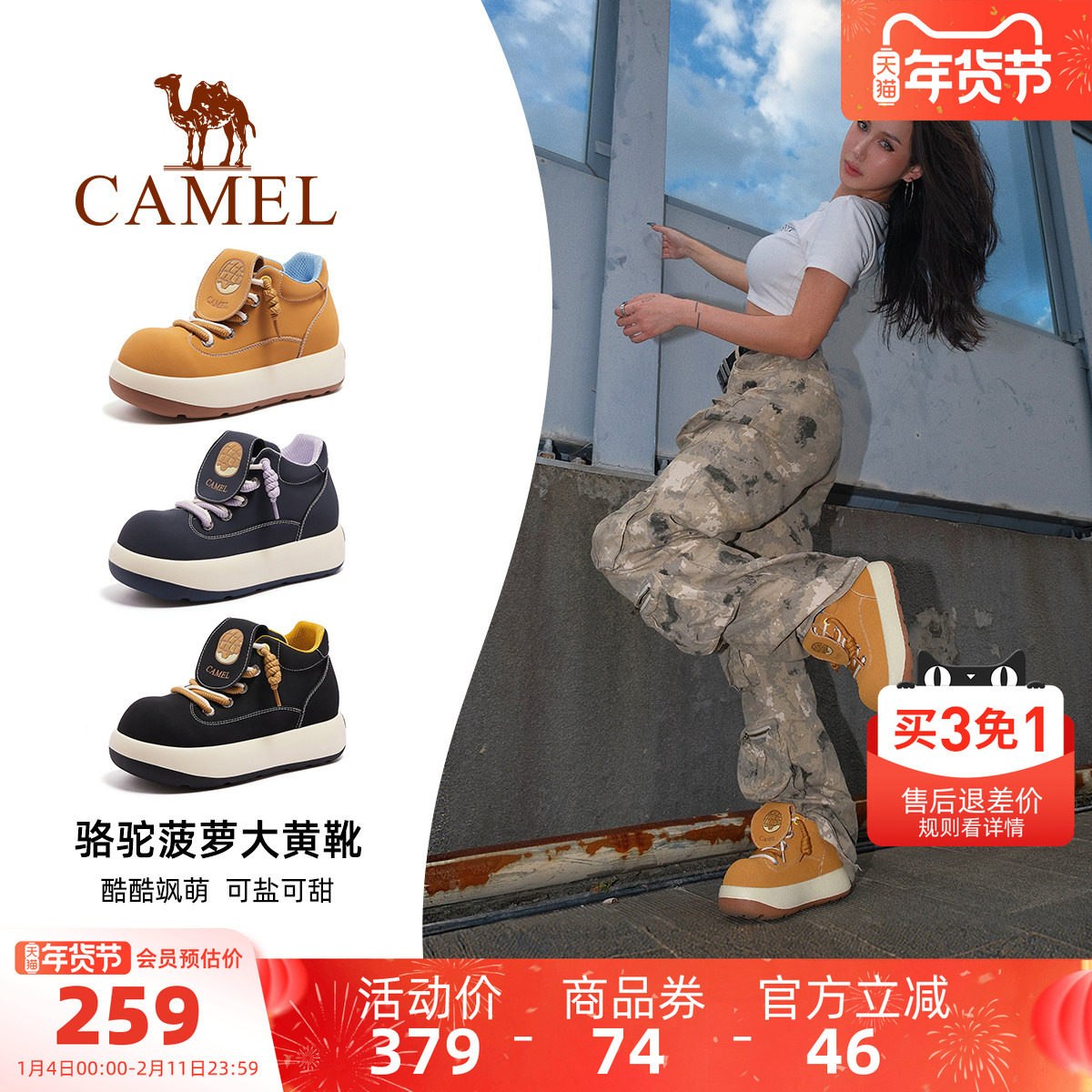 骆驼菠萝大黄靴女鞋2025秋季新款复古松糕厚底马丁靴女大头短靴子