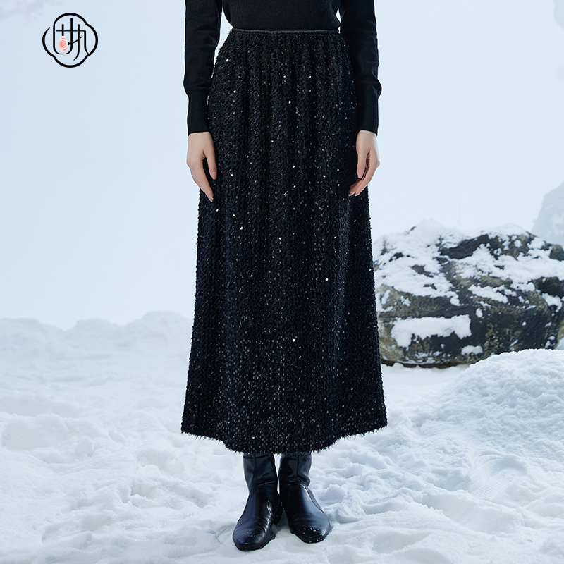 bbfer本依凡冬季半身裙女松紧腰显瘦中长款黑色长裙质感SSSYQ0053
