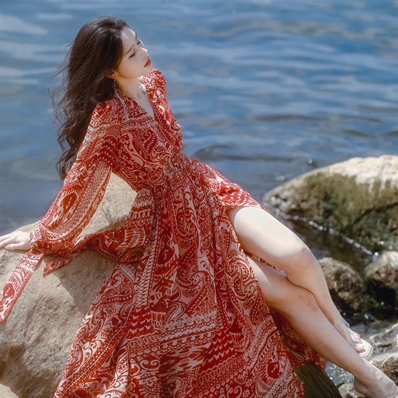 三亚沙滩裙超仙海边度假连衣裙红色大拖尾沙漠长裙拍照飘逸仙女裙