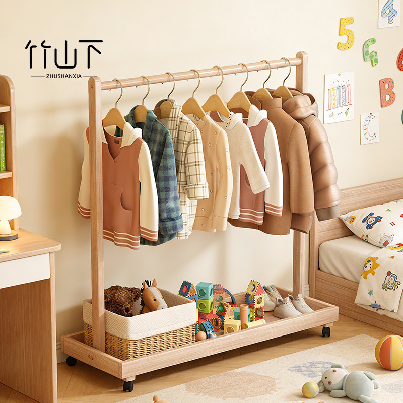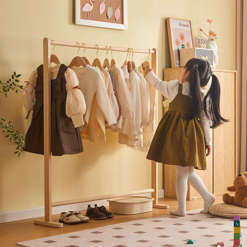 儿童实木挂衣架落地卧室单杆立式衣帽架晾衣架宝宝床边放衣服神器