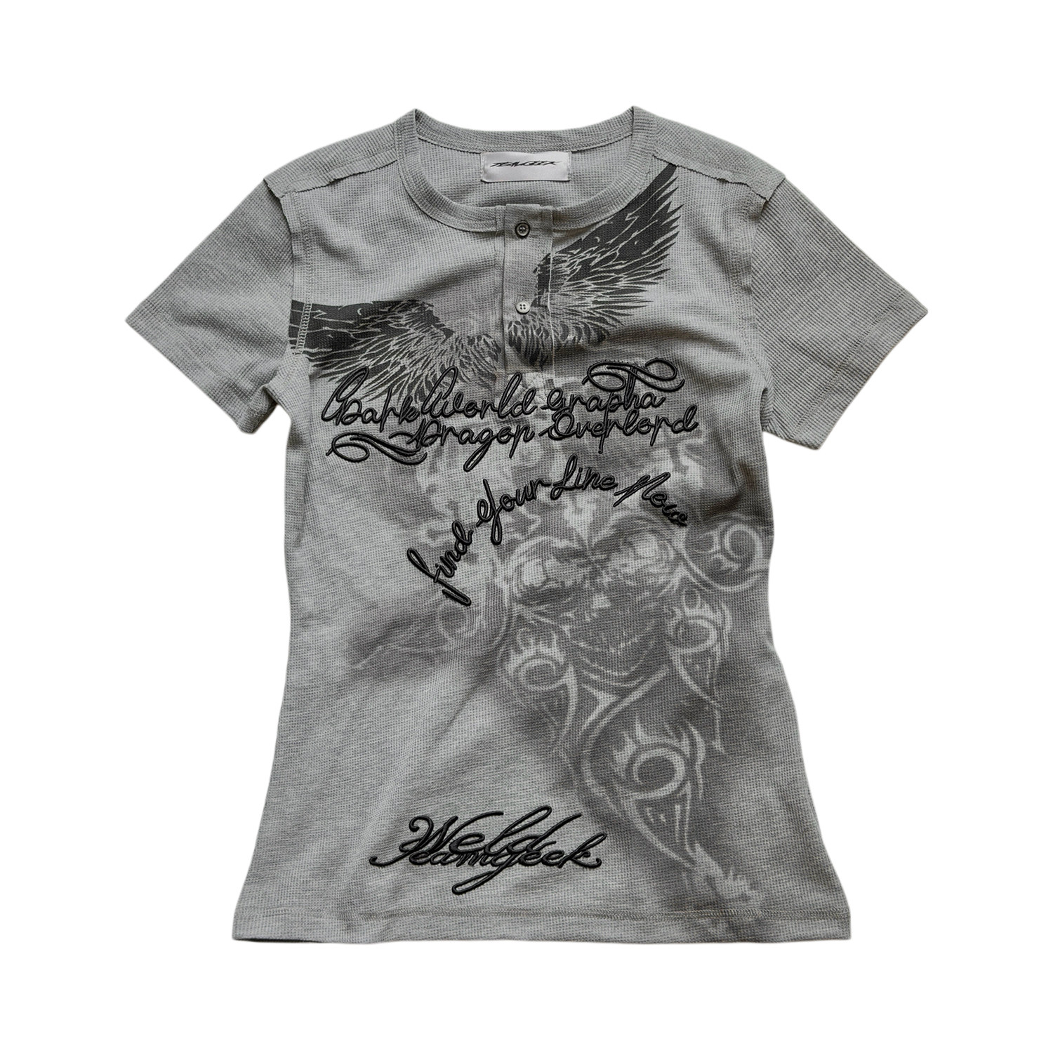 TEAMGEEK 复古图腾印花字母刺绣合身亨利领短袖T恤华夫格打底衫女