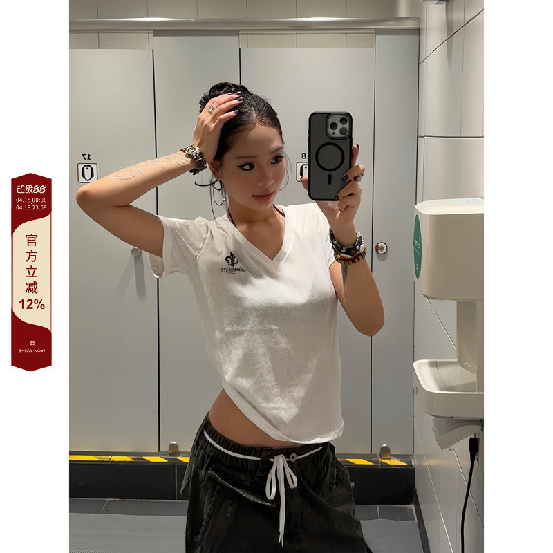 F383 2026美式复古后背字母印花V领短袖宽松休闲基础款打底衫女