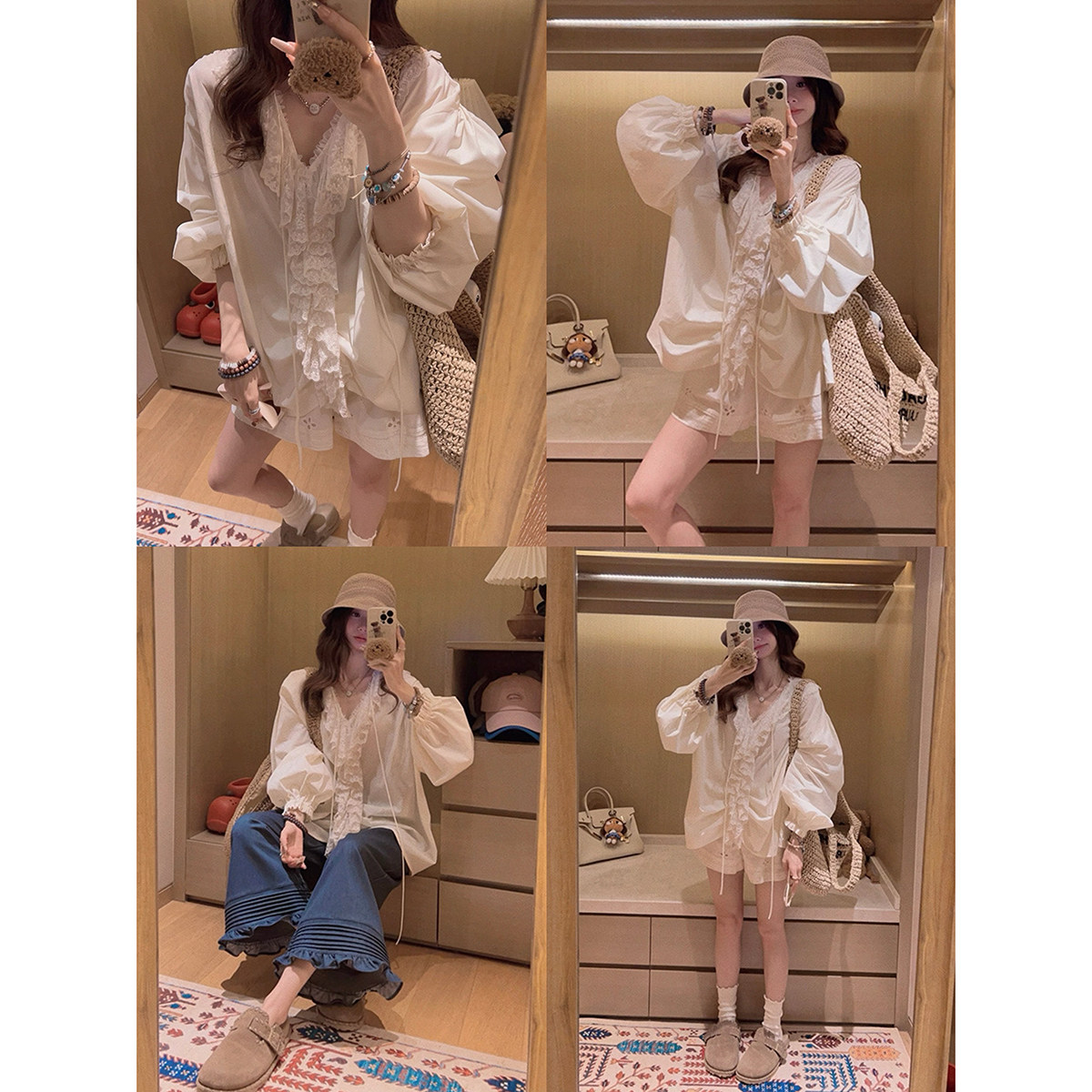 Yukiss 复古法式蕾丝边长袖衬衫上衣女春韩系小个子V领宽松打底衫