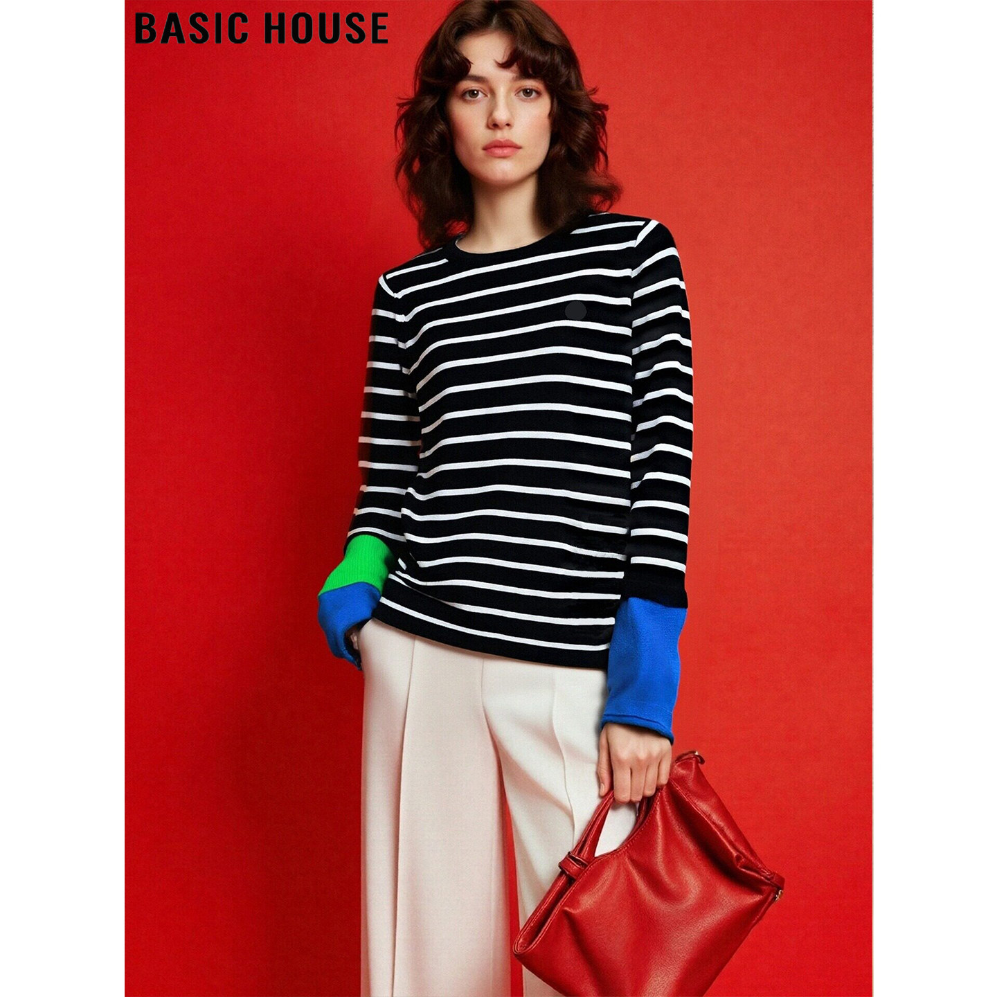 Basic House/百家好美式复古条纹撞色圆领针织衫女春季毛衣打底衫