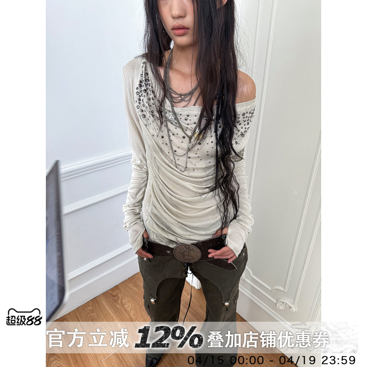 DoublePunch春秋原创荡领斜肩多穿法烫钻复古印花造型打底衫上衣