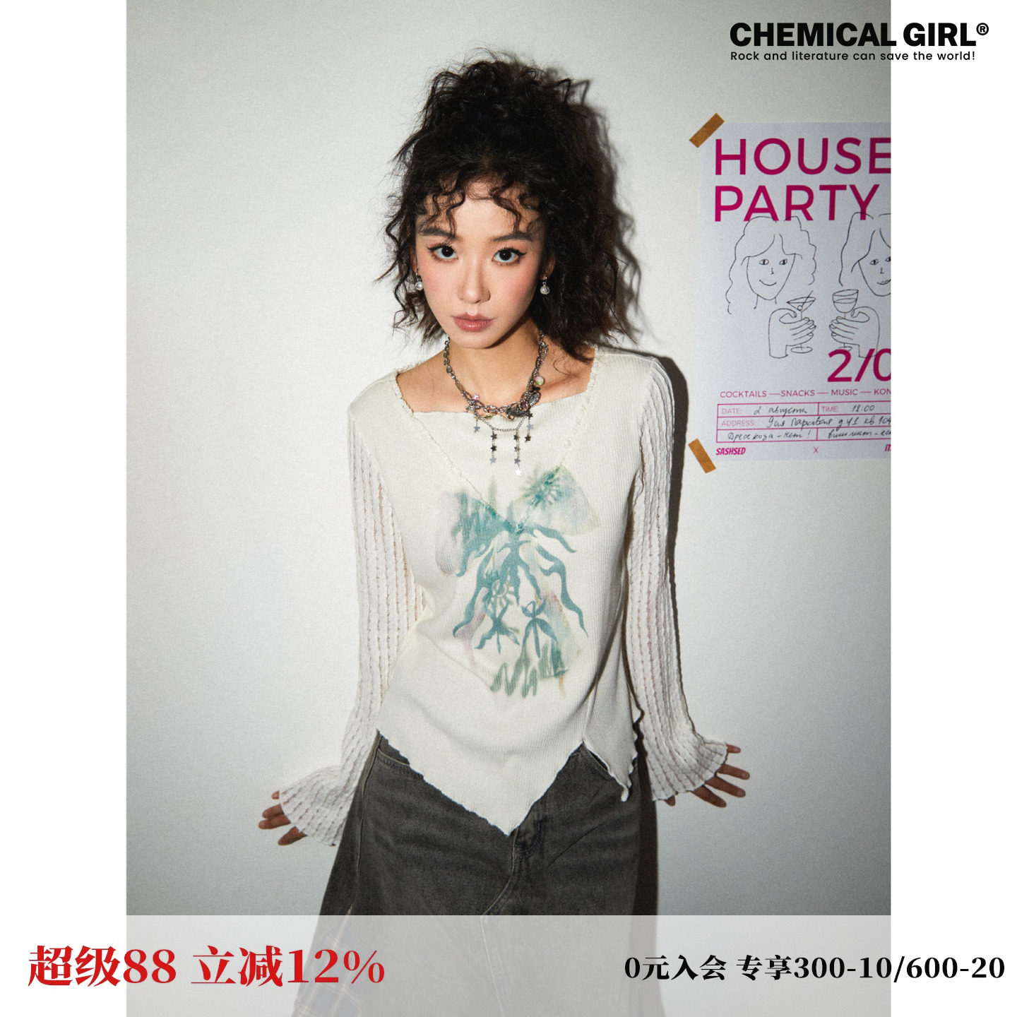 化学少女「雾雨森林」方领复古印花修身打底衫秋装长袖T恤上衣女