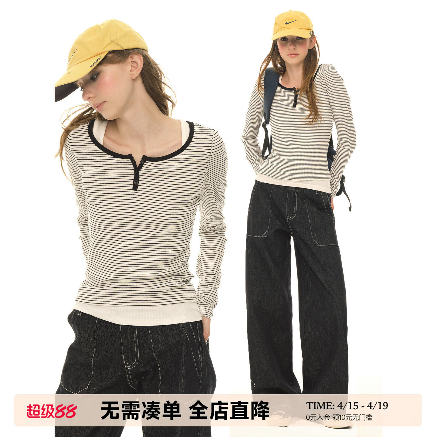UNRETRO 圆领条纹长袖T恤女春秋修身叠穿内搭美式复古打底衫上衣