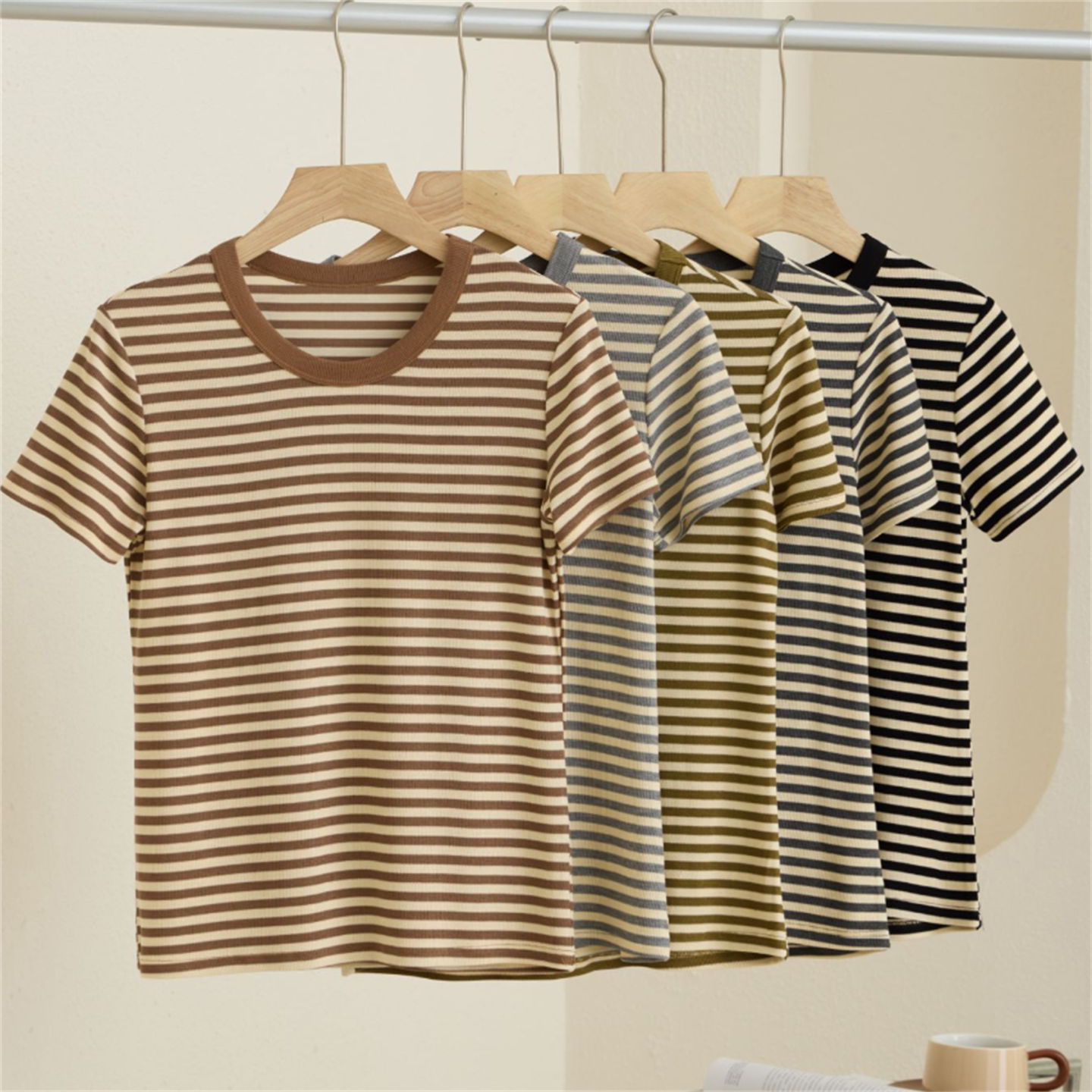 2026年夏季新款条纹短袖T恤女复古显瘦打底衫外穿舒服透气上衣