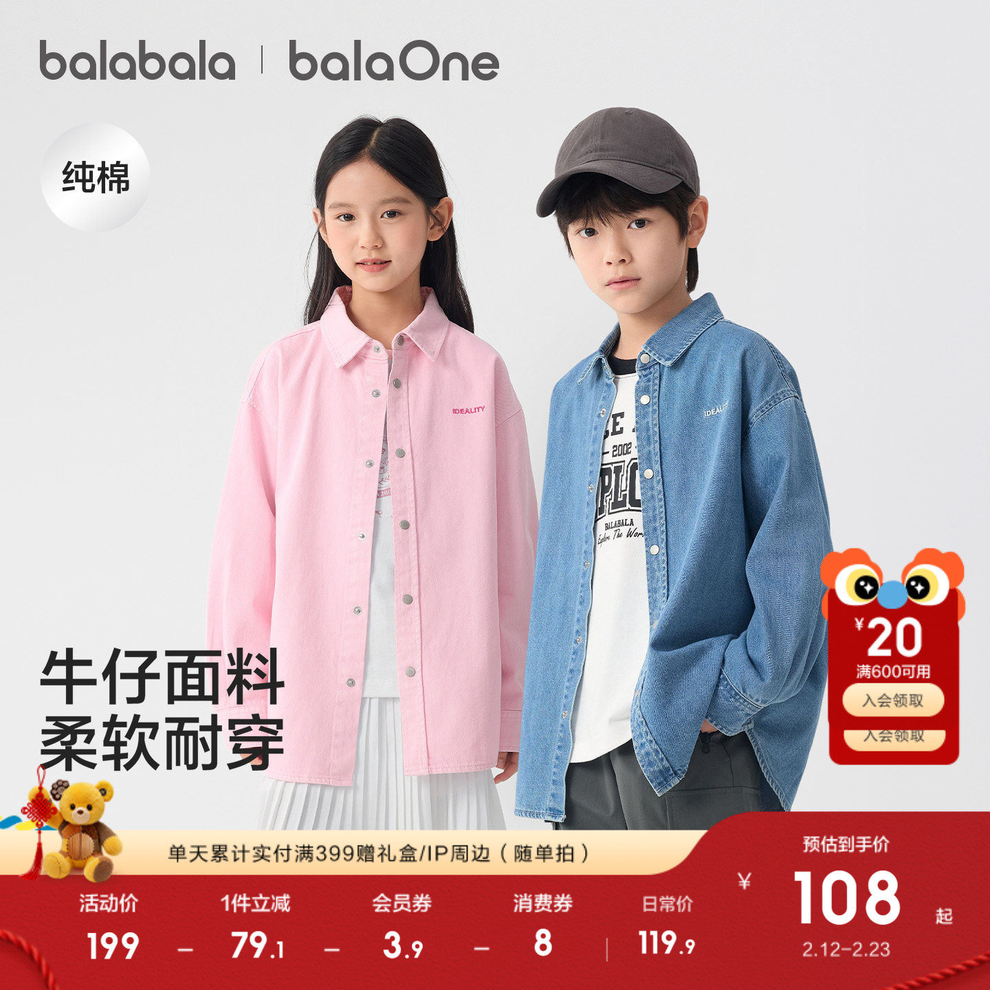 巴拉巴拉童装儿童长袖衬衫女童男童2026新款春装牛仔上衣纯棉舒适