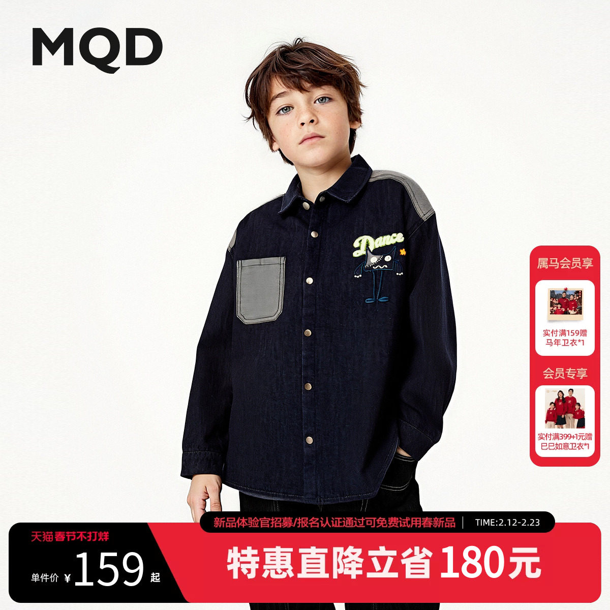 MQD童装男童翻领牛仔衬衫2025冬季新款儿童拼接长袖绣花宽松外套