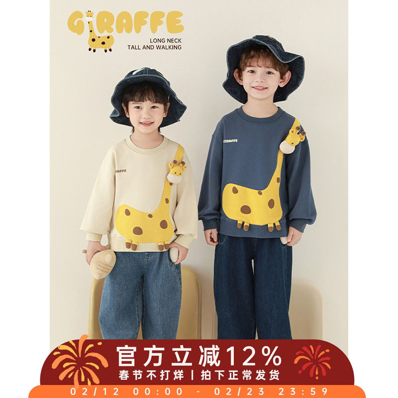 幼悠男童2026春季长袖圆领长颈鹿休闲卫衣简约显瘦百搭儿童牛仔裤