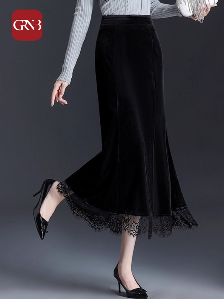 GRNB黑色长款半身裙女高级感金丝绒裙子秋冬季新款蕾丝边包臀裙