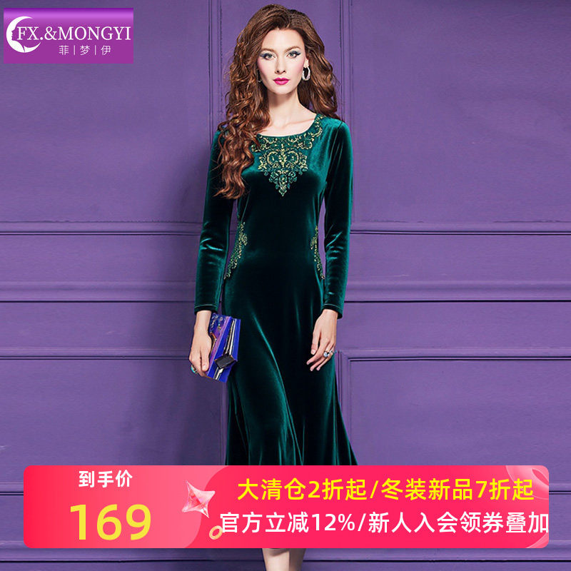 菲梦伊金丝绒绣花连衣裙女冬季法式复古高级感轻熟收腰打底礼服裙