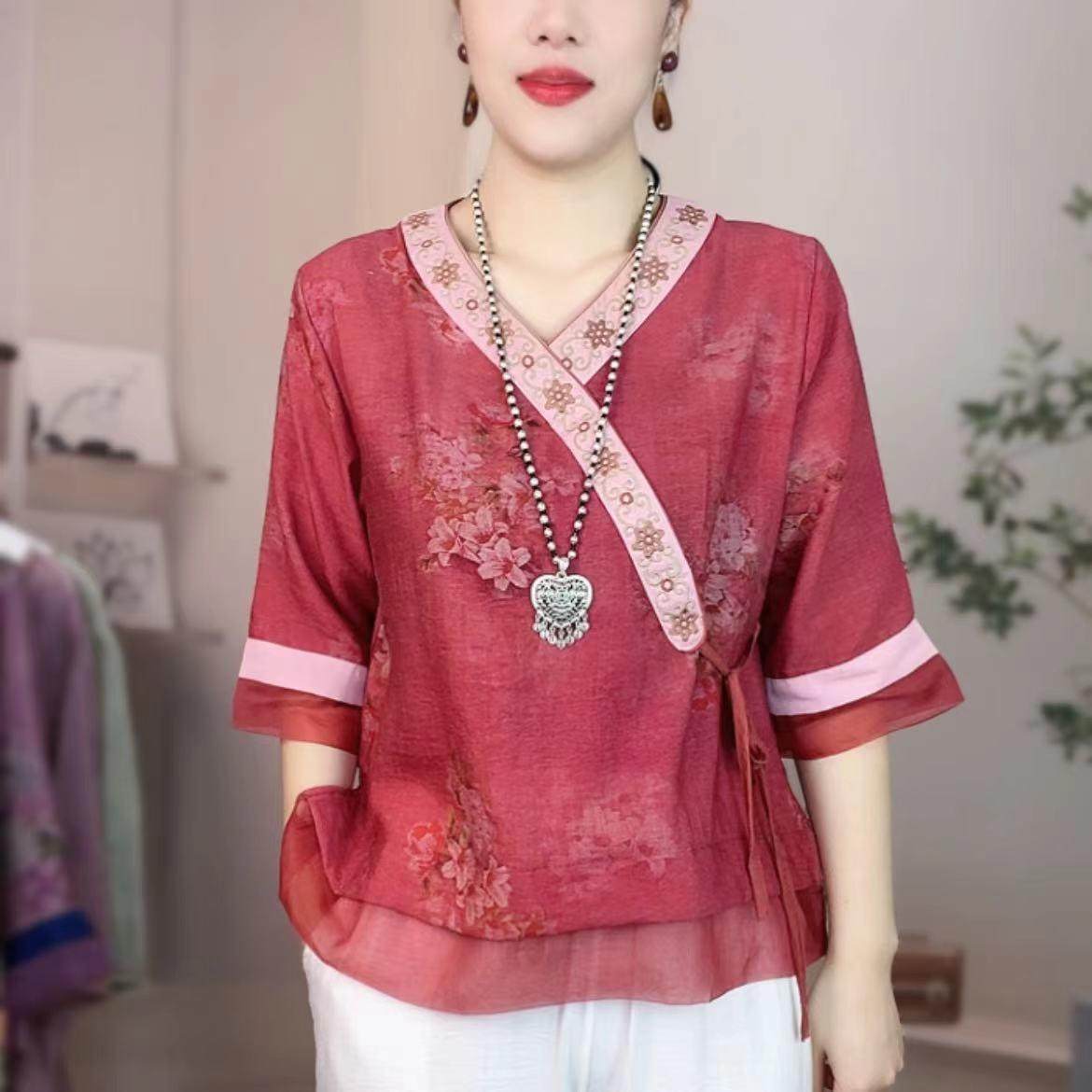 民族风V领刺绣棉麻衬衫女夏款妈妈装五分袖时尚小衫气质减龄上衣
