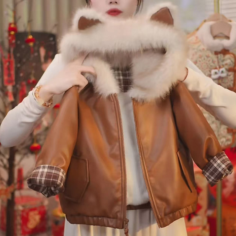 - 皮衣女加绒加厚冬