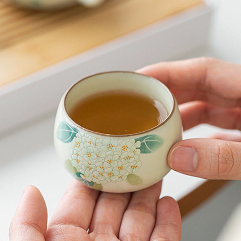 米黄汝窑绣球花茶杯主人杯汝瓷个人单杯陶瓷功夫小茶杯客杯品茗杯