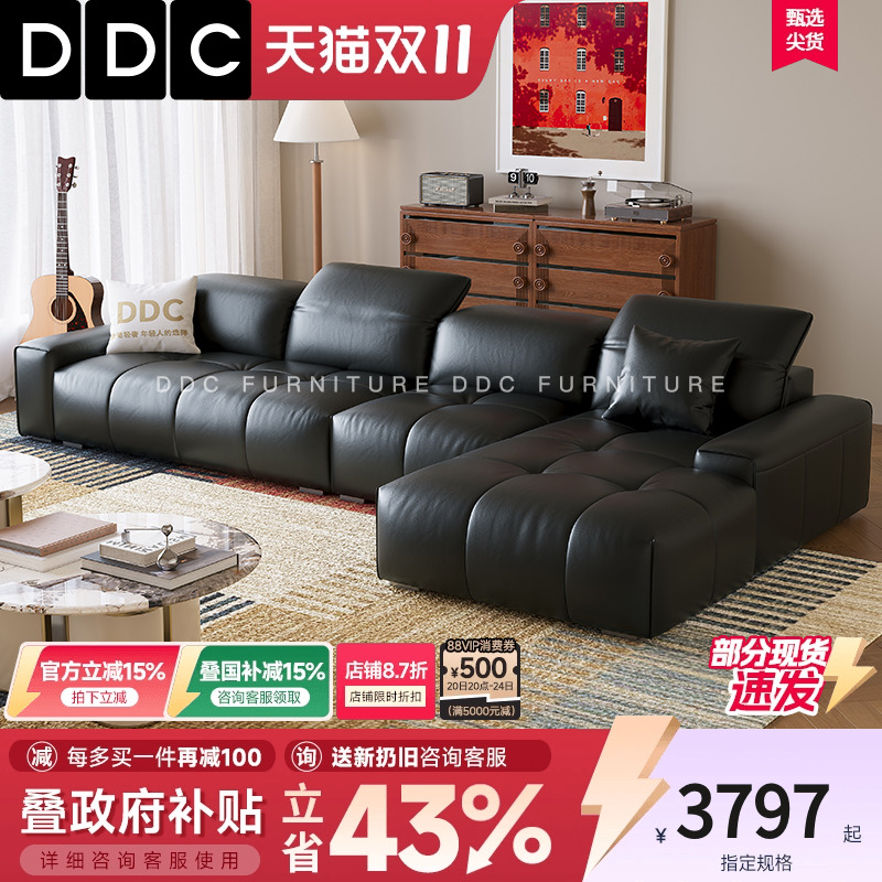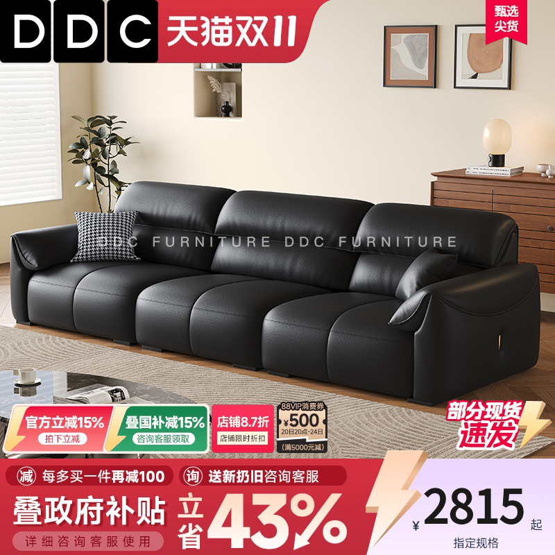 政府补贴DDC意式极简大象耳朵全真皮沙发客厅新款全青皮黑色沙发