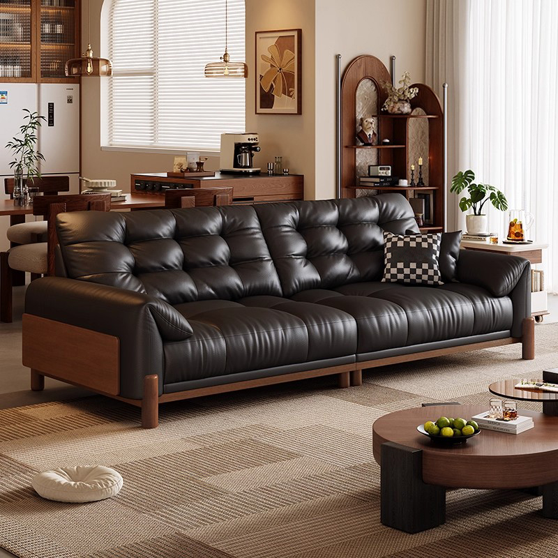 瑞雪原木中古风客厅实木沙发复古头层牛皮2025新款模块黑色沙发
