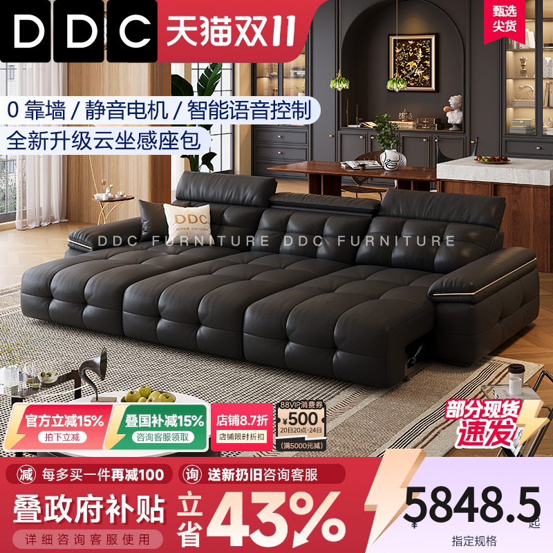 DDC简约现代零靠墙电动多功能黑色沙发客厅头层牛皮抬腿大小户型