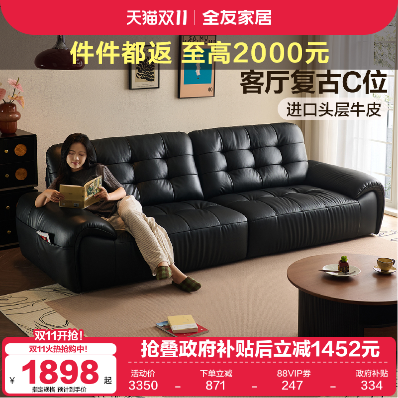 全友家居复古风客厅真皮沙发2025新款黑色沙发家具高端大气上档次