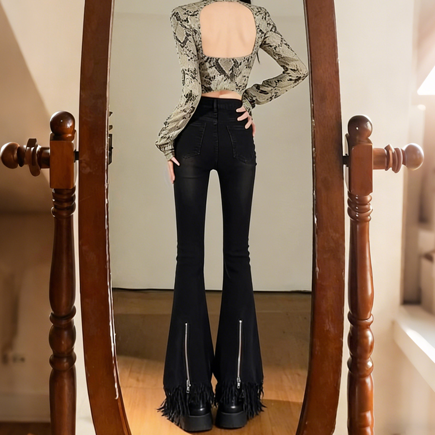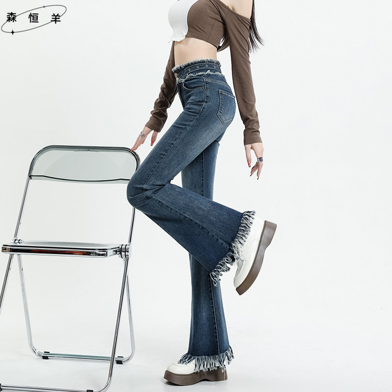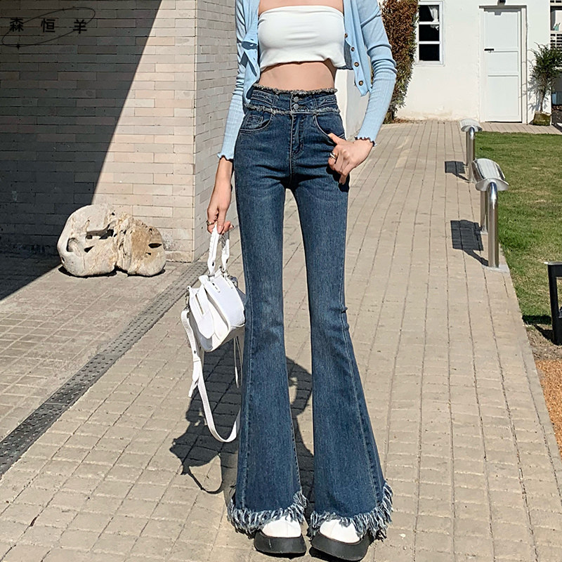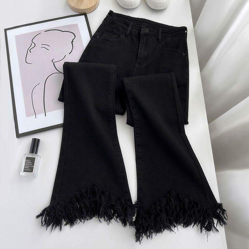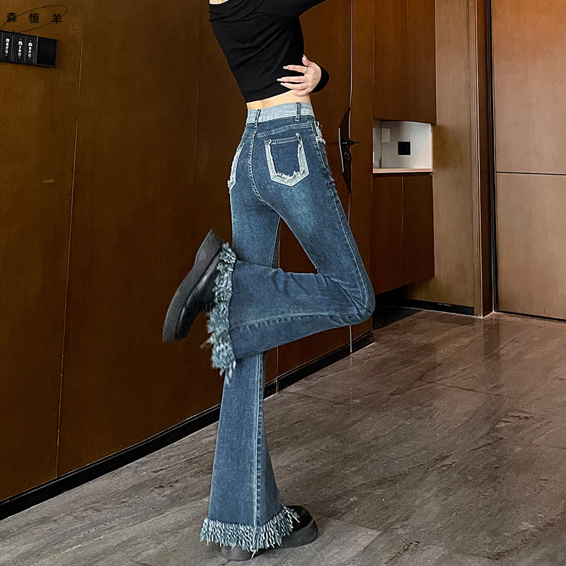 流苏微喇牛仔裤女春秋新装新款垂感高腰显瘦女士复古马蹄喇叭裤子