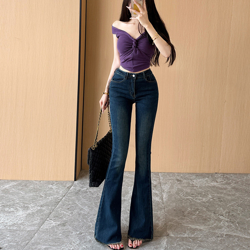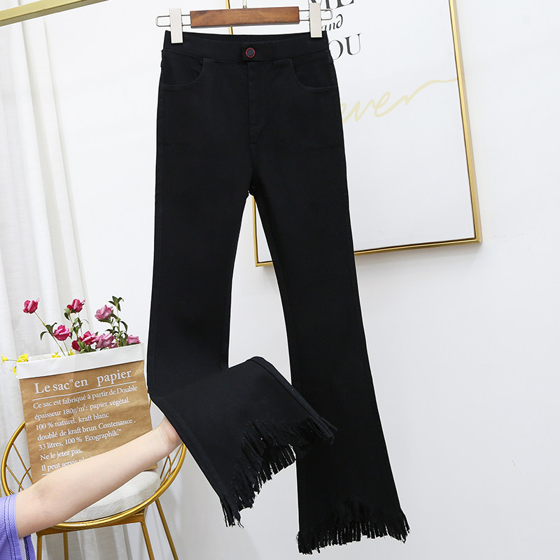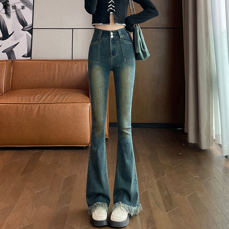 复古毛边流苏微喇叭牛仔裤女长裤春秋季新装弹力高腰显瘦马蹄裤子