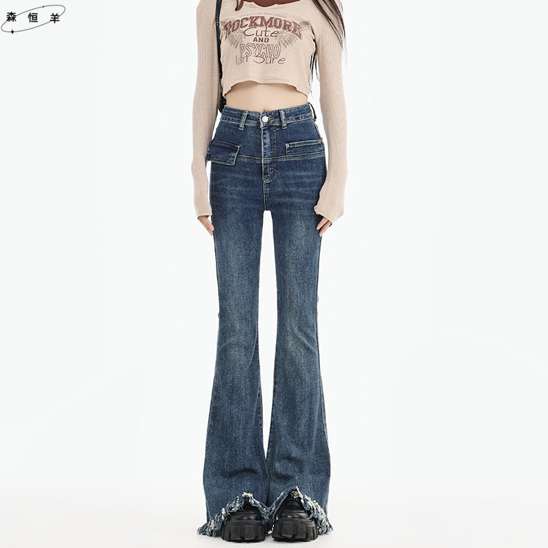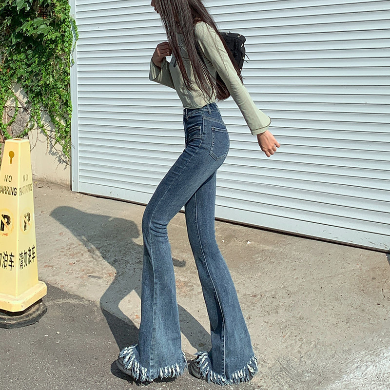 微喇牛仔裤女春秋新款遮胯紧身复古流苏毛边喇叭裤子弹力显瘦加长