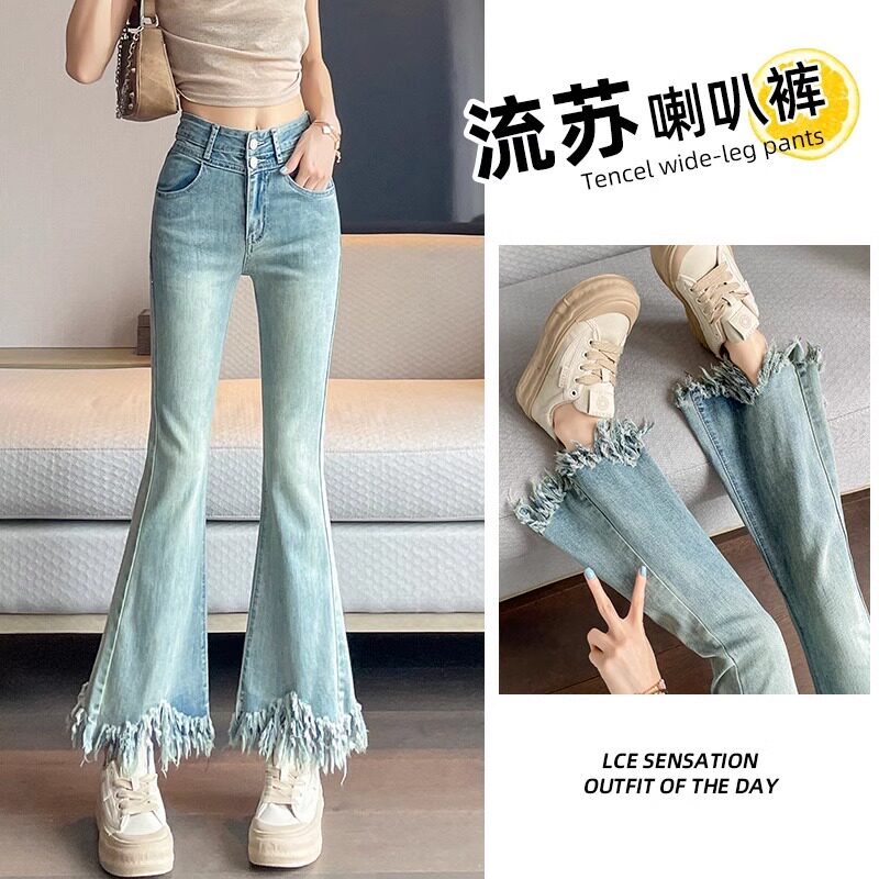 2026春季牛仔喇叭裤流苏边小个子修身高腰显瘦垂感毛边微喇牛仔裤