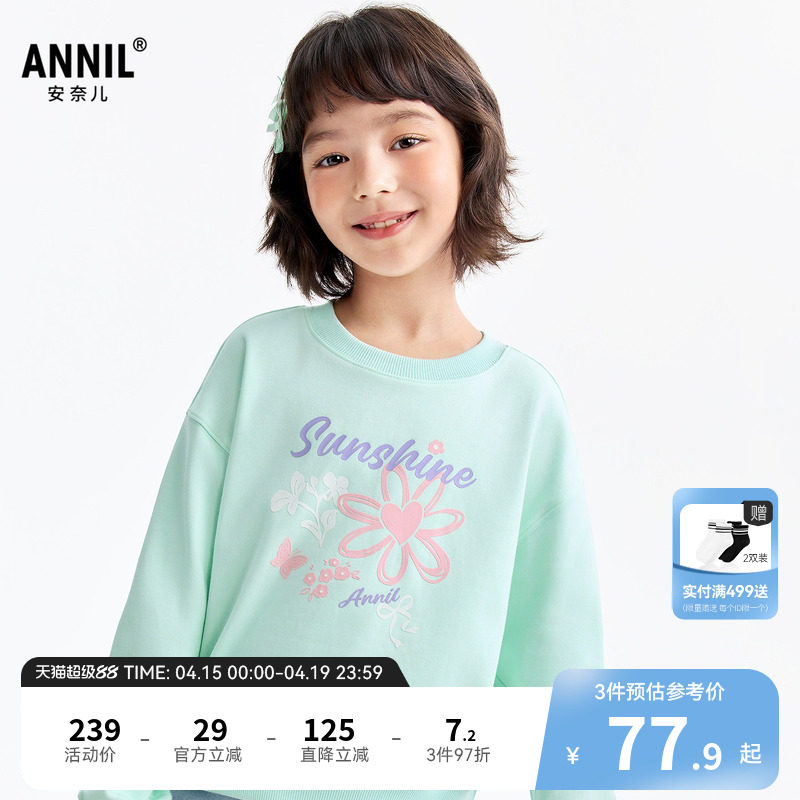 安奈儿童装女童圆领长袖卫衣2026春新款可爱甜美印花弹力宽松短款