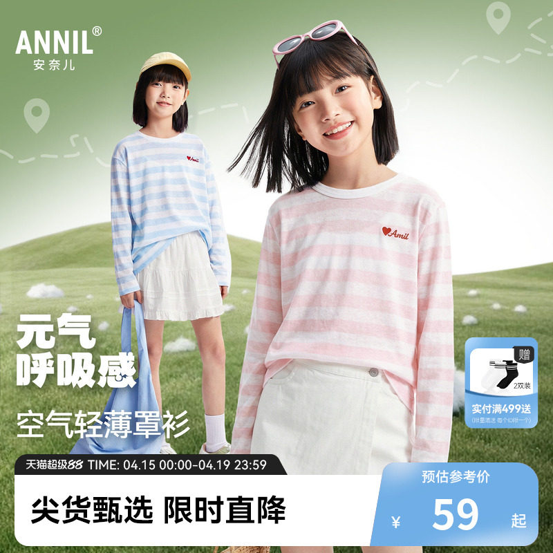 【百搭罩衫】安奈儿童装女童宽松长袖条纹T恤2026夏新款内搭吊带