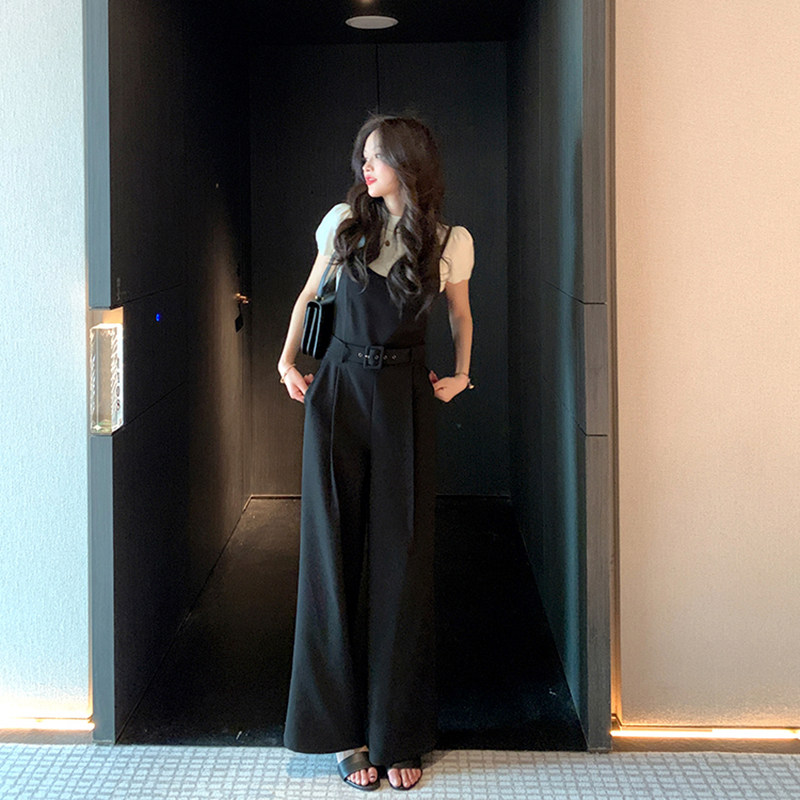 pusumede黑色无袖吊带连体裤女收腰阔腿背带裤气质通勤休闲连衣裤