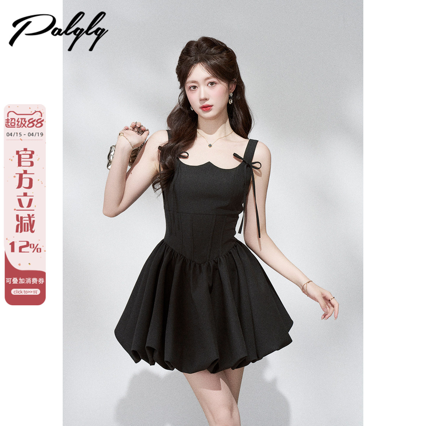 Palglg法式富家千金风黑色背带连衣裙女夏季收腰鱼骨花苞裙小黑裙