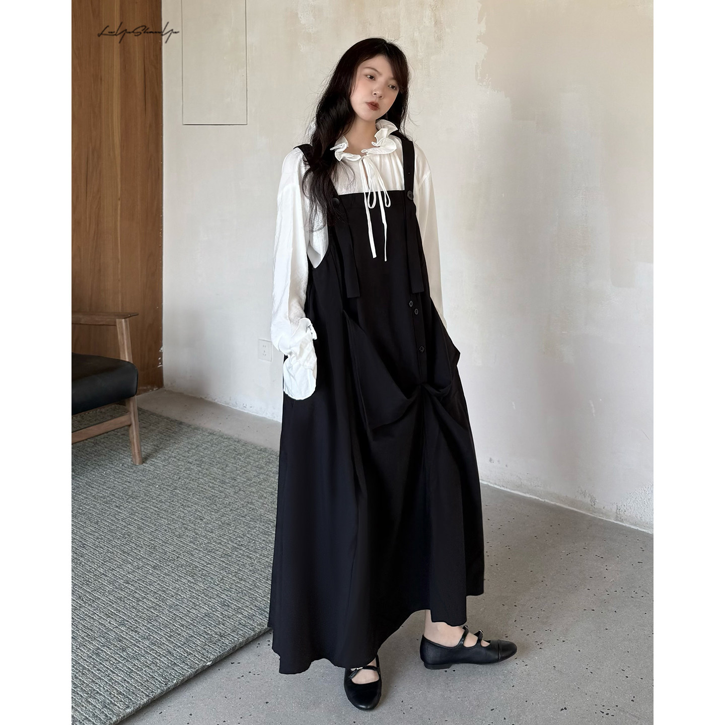 Carolingian小众设计显高长裙!腔调黑色背带裙连衣裙 吊带长裙女